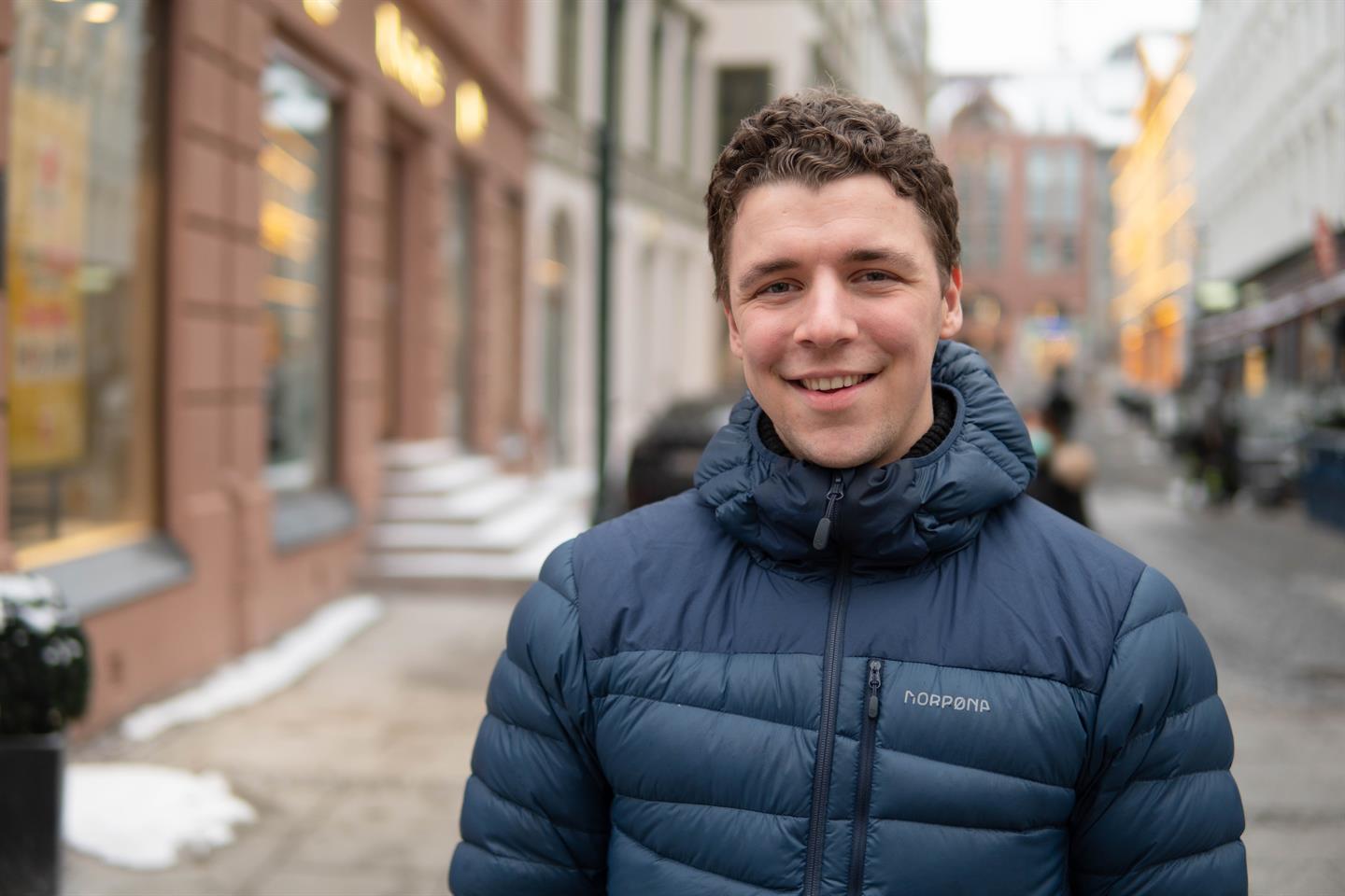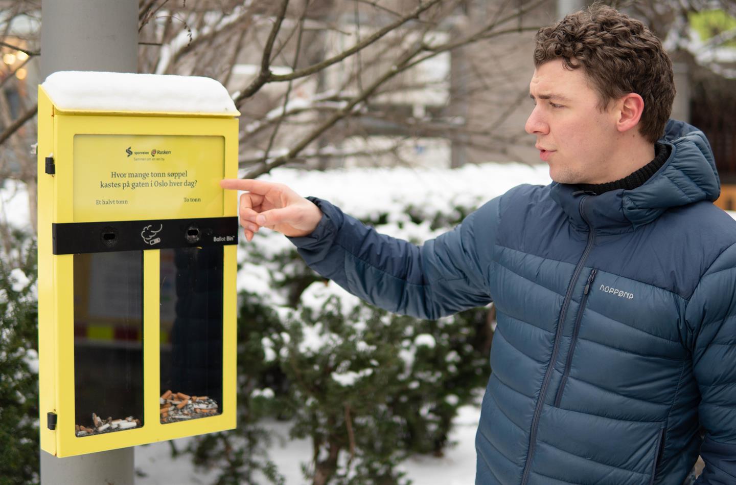 Bildet: Ved siden av studiene jobber Josva Torrey Ringøen Baller som junior associate i Nordic Navigation AS. I tillegg jobber han i Sneipfritt, et firma som blant annet står bak disse gule askebegrene som skal bidra til mindre forsøpling i naturen.